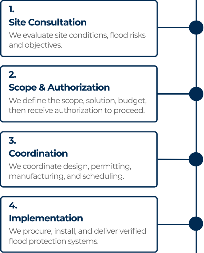 FloodReady delivers flood protection systems through a disciplined, end-to-end phased process engineered for commercial and critical infrastructure.